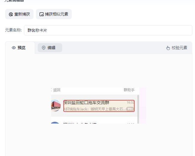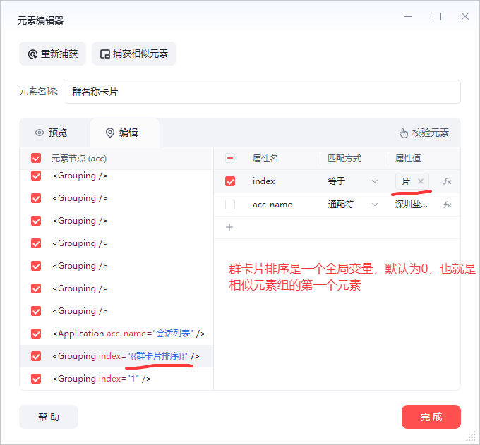说明:群名称卡片这个元素是一个相似元素组,但是我在倒数第二个元素节点那里把index的值填写为全局变量“群卡片排序”,默认为0,为了让它每次都从群列表的第一个开始点击