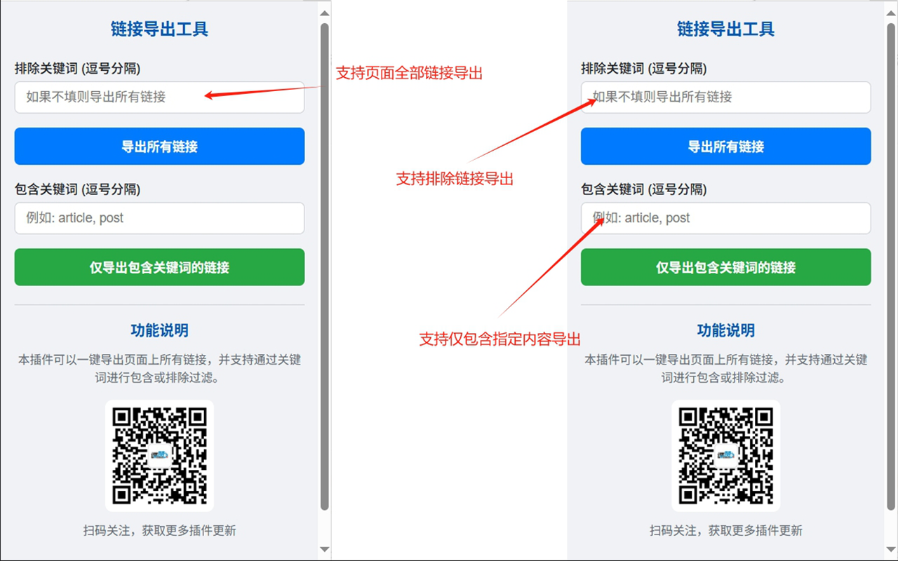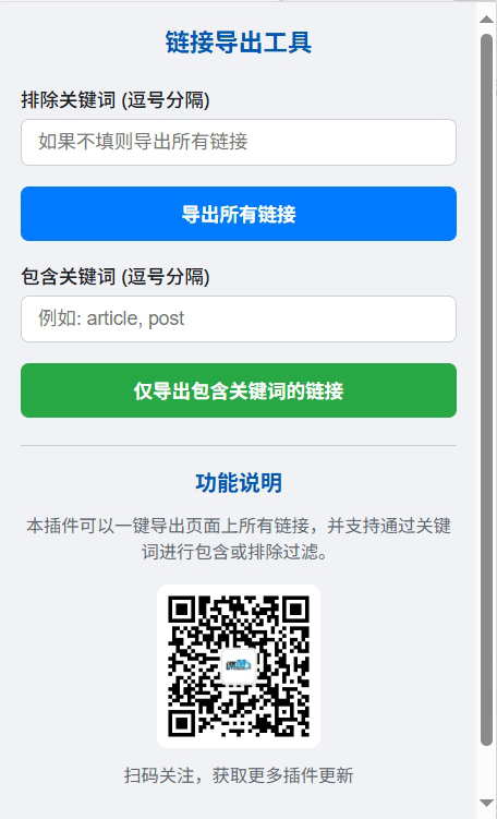 3. 关键词包含: 在“包含关键词”输入框中,您可以指定一个或多个关键词(用逗号分隔)。点击“仅导出包含关键词的链接”后,只有那些包含您指定的关键词的链接才会被导出。