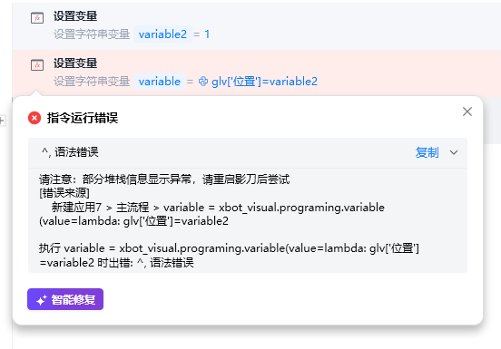 这是什么问题,我尝试变更全局变量,提示错误。全局变量用字符串或者整数都试过,也重启软件和重启过电脑
