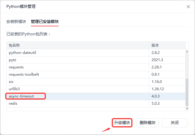 我们只需要在开发环境中的python模块包管理界面,把async-timeout这个模块升级模块,然后再次发版运行就能运行成功啦
