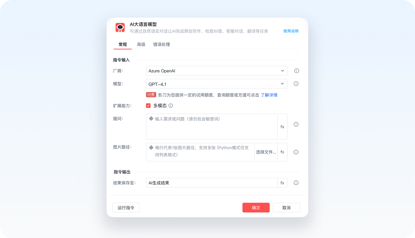 我们发现用户在使用AI大语言模型时,期待调用更多AI原生的特性,例如让AI辅助分析图片内容。为此,我们对AI大语言模型指令进行了升级。现在,当你选择对应的模型后,即可启用多模态输入(目前仅支持图片),这意味着影刀已具备解析图像内容的能力,能够“看见”并“理解”你上传的图片信息,期待这个功能对你有帮助 😎