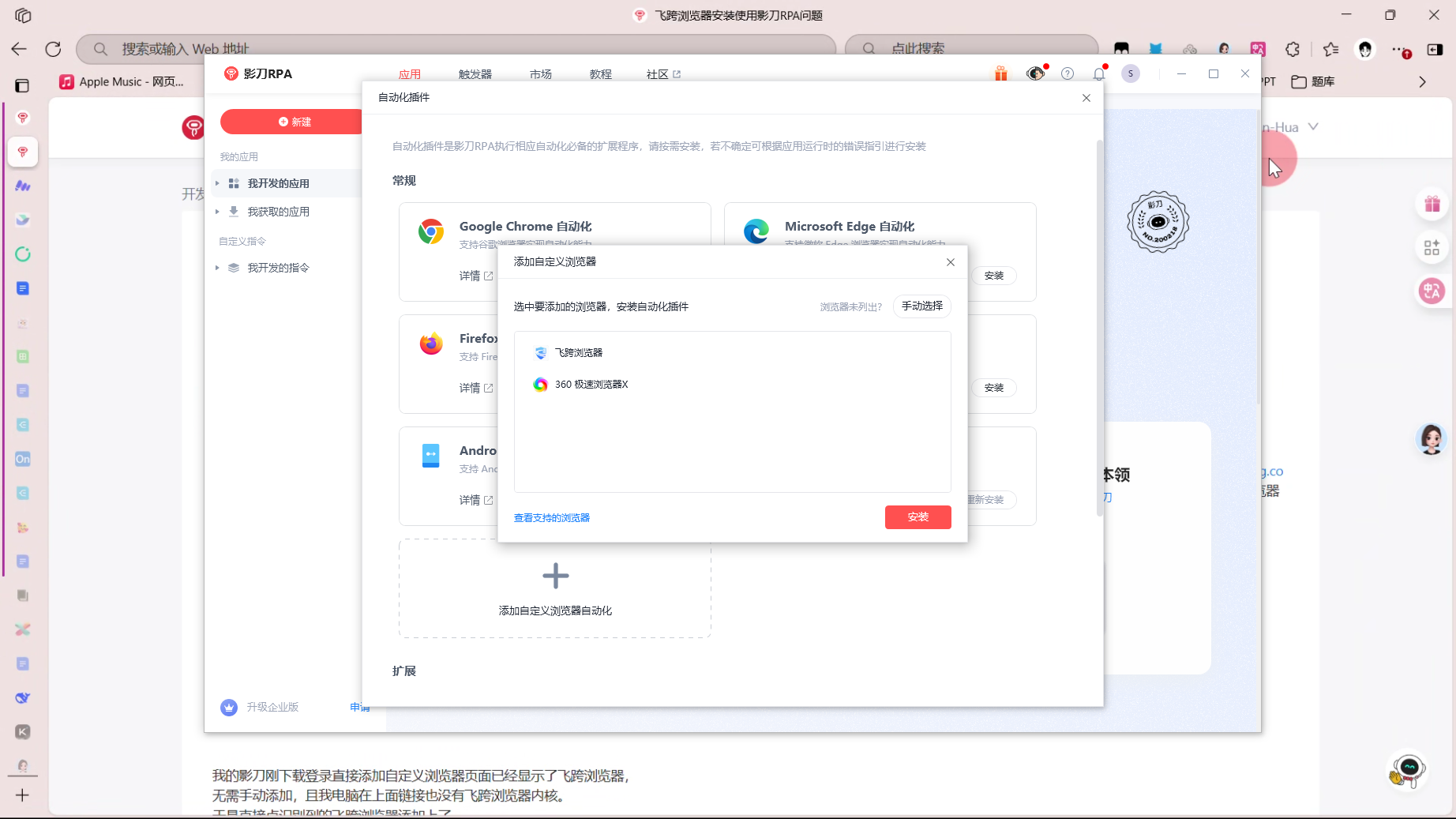 重启应用和浏览器,重装影刀浏览器插件,切换成 Manifest V2 版本的影刀浏览器插件。