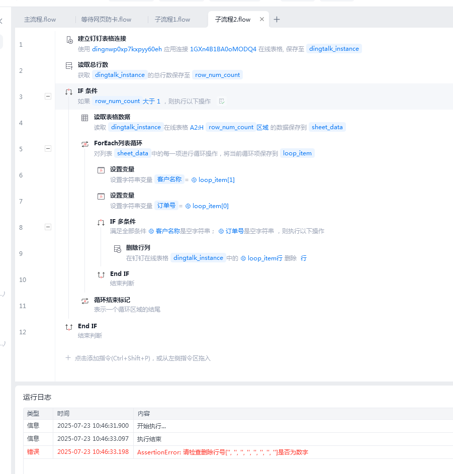我想弄一个钉钉表格,然后用应该审钉钉表格上面的单,想先在审单前,判断订单表格有没有空白行,如果有,我就先删除空白行,这个我写了一个流程,但是有这个报错,请问怎样修改