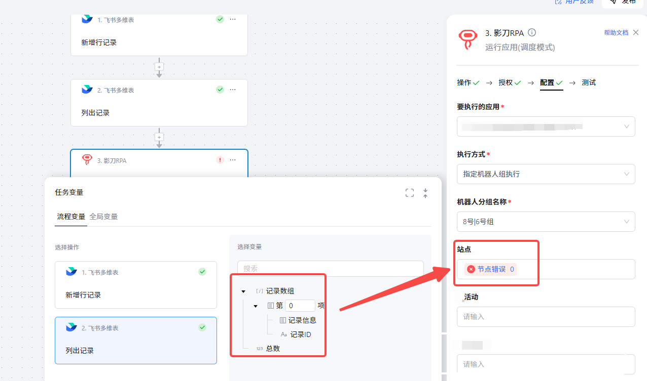 高级任务主体结构:飞书新增记录--获取记录--执行RPA
