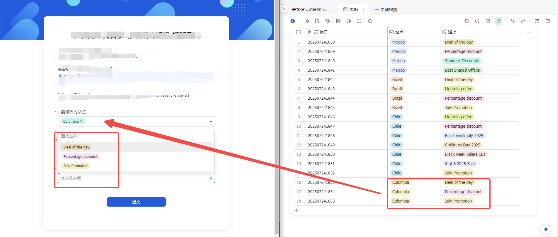 在选择哥伦比亚时,下面的下拉选择只会提供哥伦比亚站点的活动,不会展示其他站点的活动。