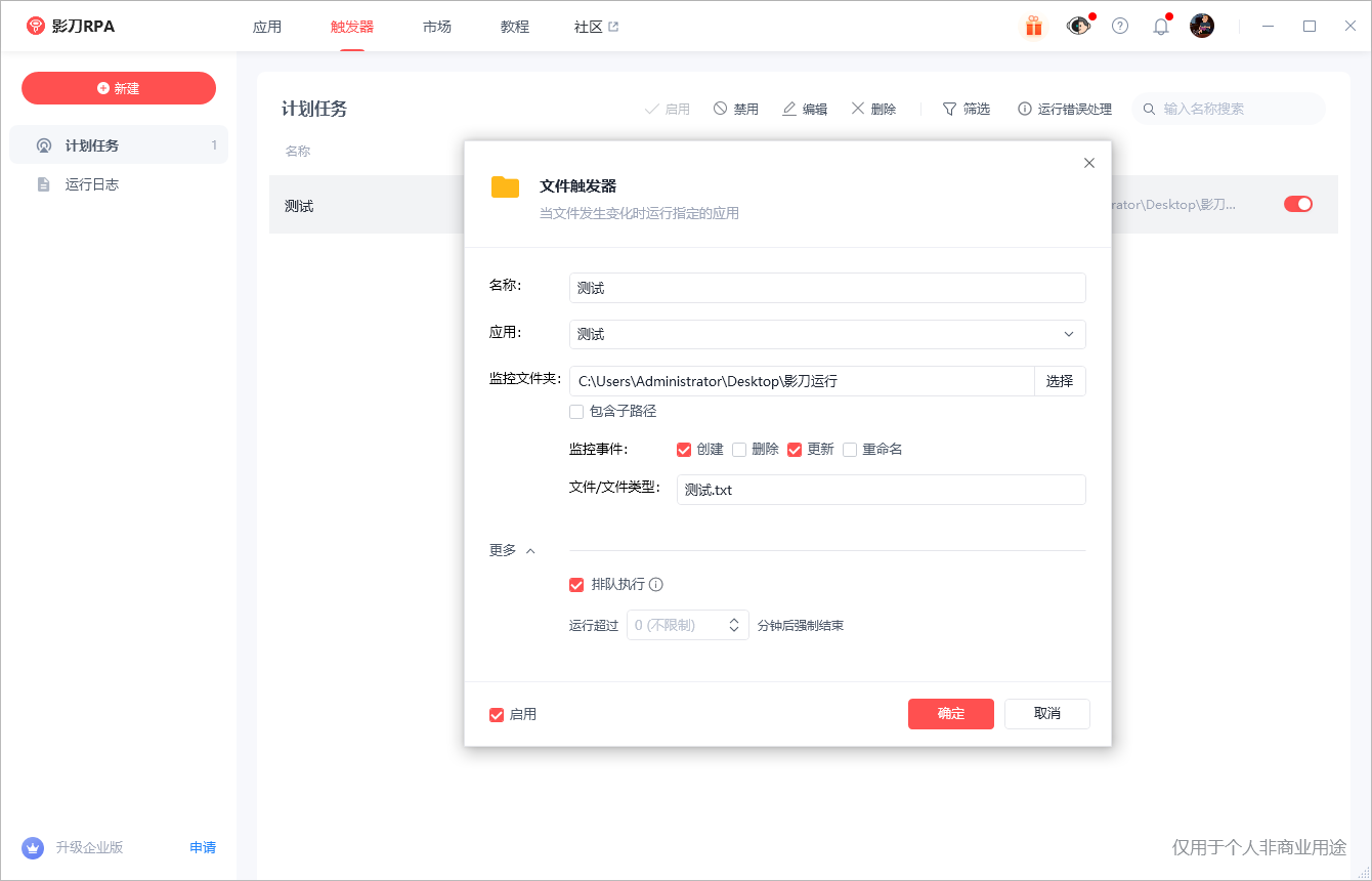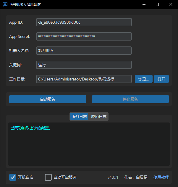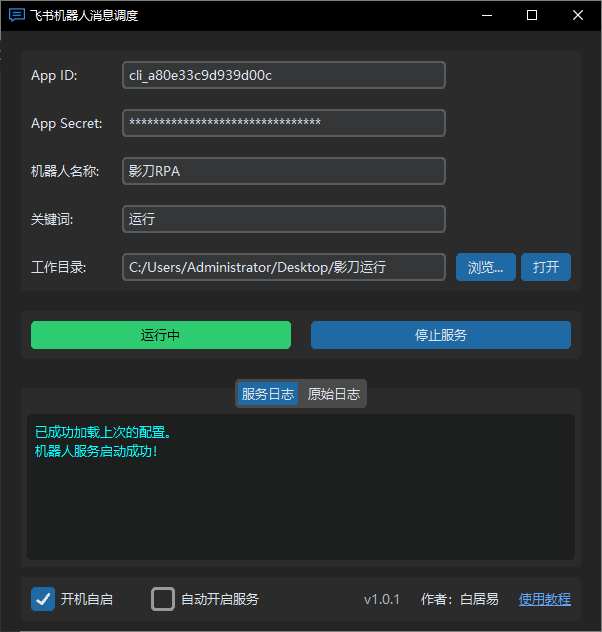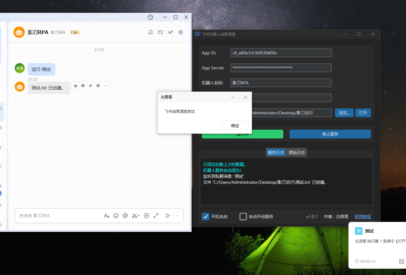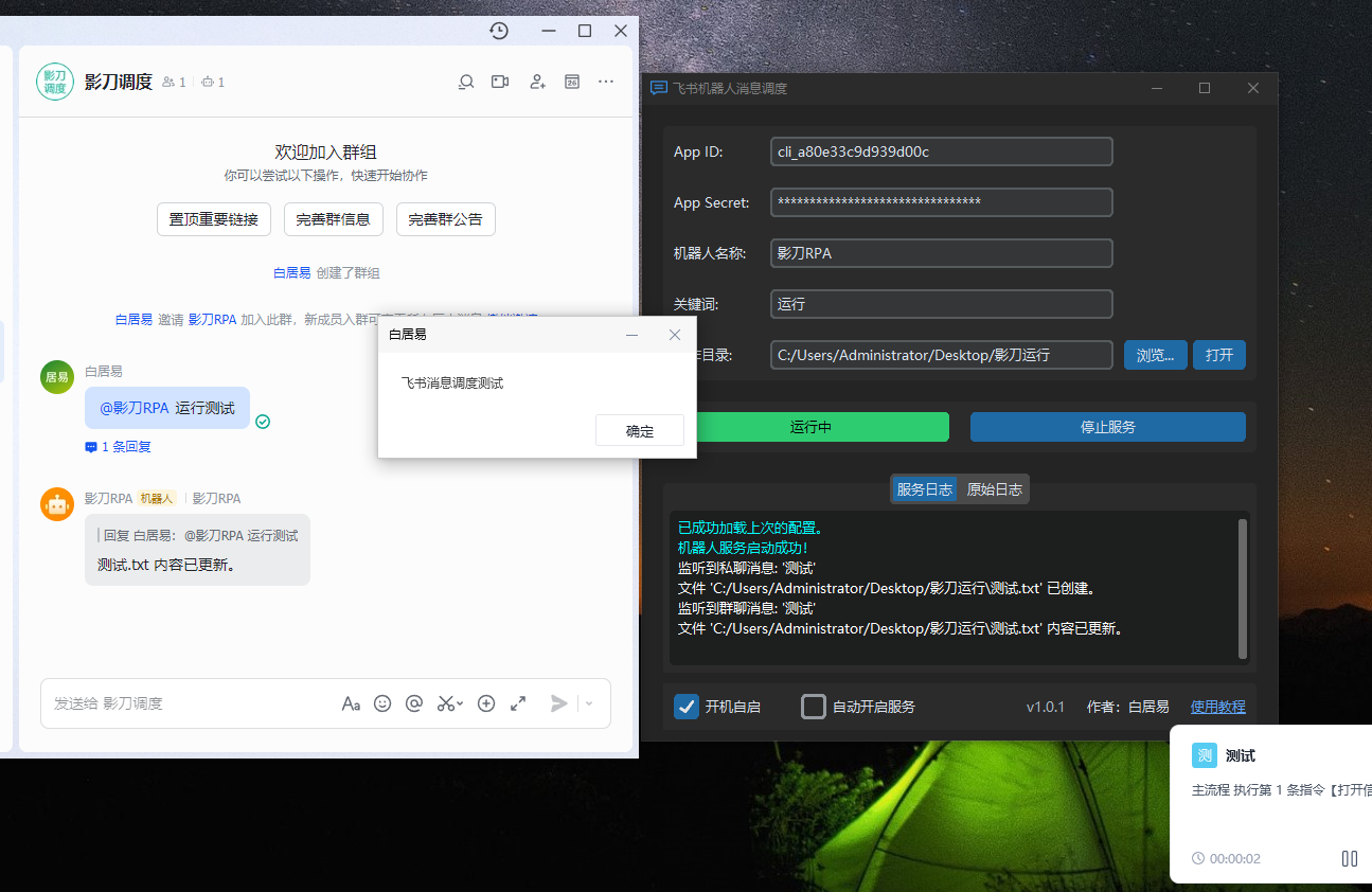 飞书机器人消息调度是一款用于监听飞书机器人消息并触发影刀RPA脚本运行的工具类应用。通过配置关键词和工作目录,可在接收到指定消息时自动创建或更新文件,从而触发影刀RPA的文件触发器。