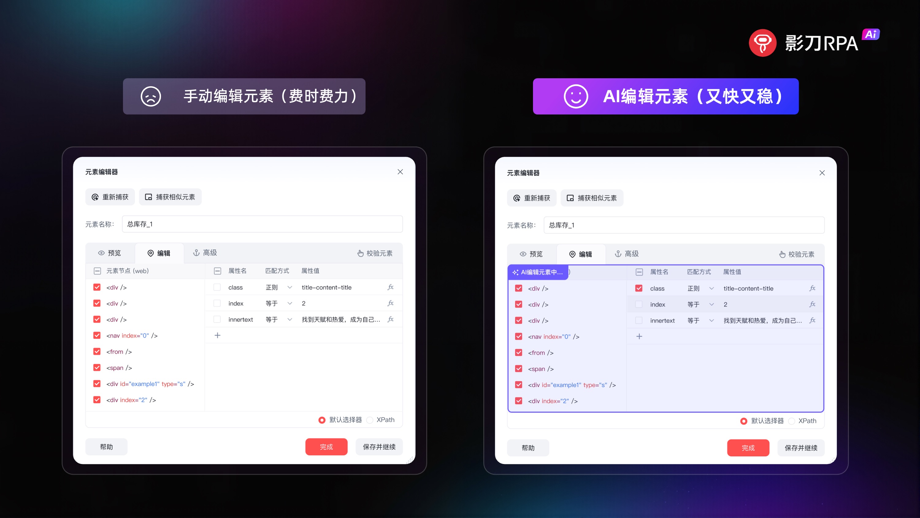 这些问题在用户实际操作中尤为明显:精心设计的自动化流程突然报错 “未找到元素”;网页表单布局稍一变化,之前捕获的输入框就失效;反复调整元素路径、属性,耗费大量时间却依然不稳定……