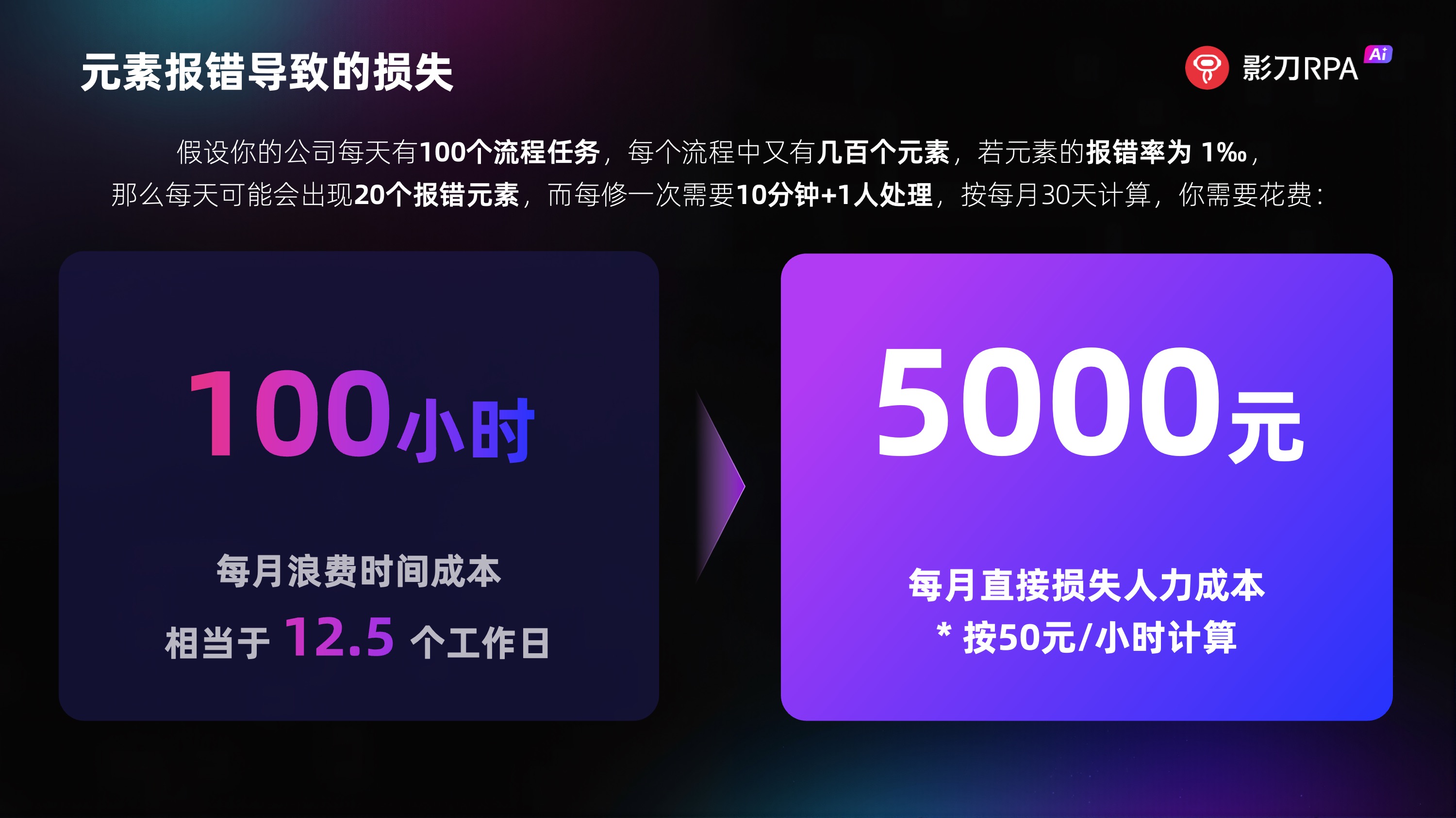 假设你的公司每天有100个流程任务,每个流程中又有几百个元素,若元素的报错率为1‰,那么每天可能会出现20个报错元素,而每修一次需要10分钟+1人处理,按每月30天计算,你需要花费: