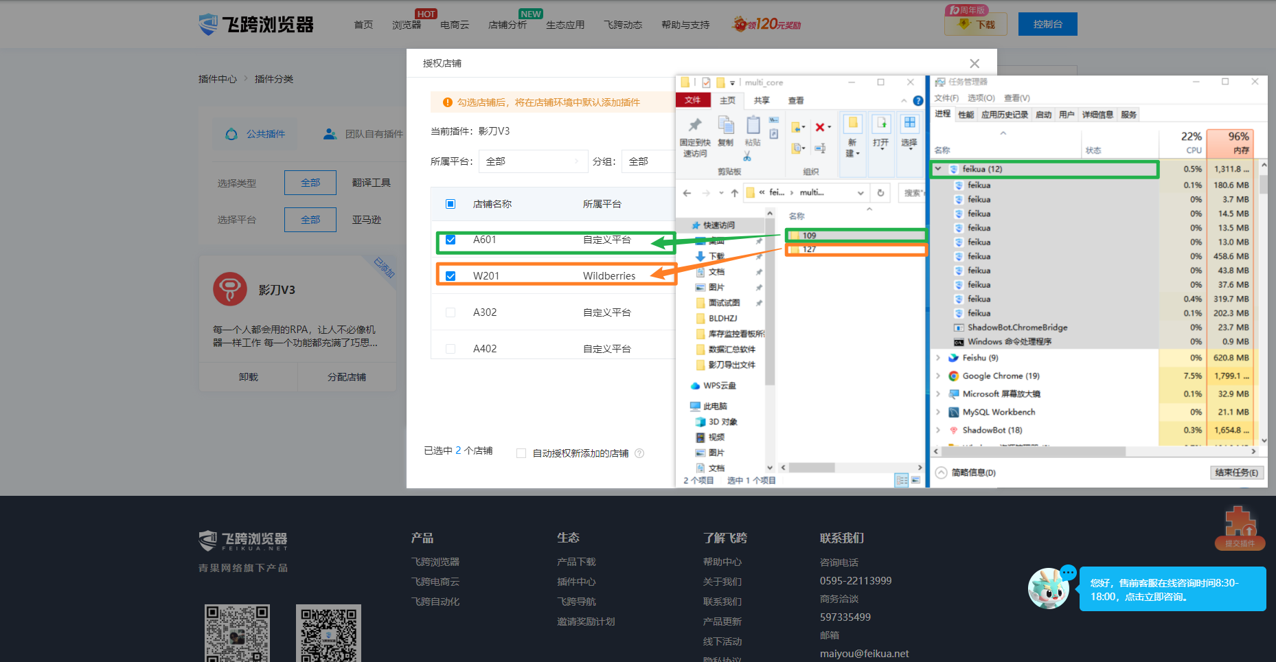 飞跨浏览器:在插件中心将影刀RPA(Manifest V3 版本)插件分配店铺如下图一。 有 2 个店铺浏览器就有 2 个文件夹路径的浏览器内核。