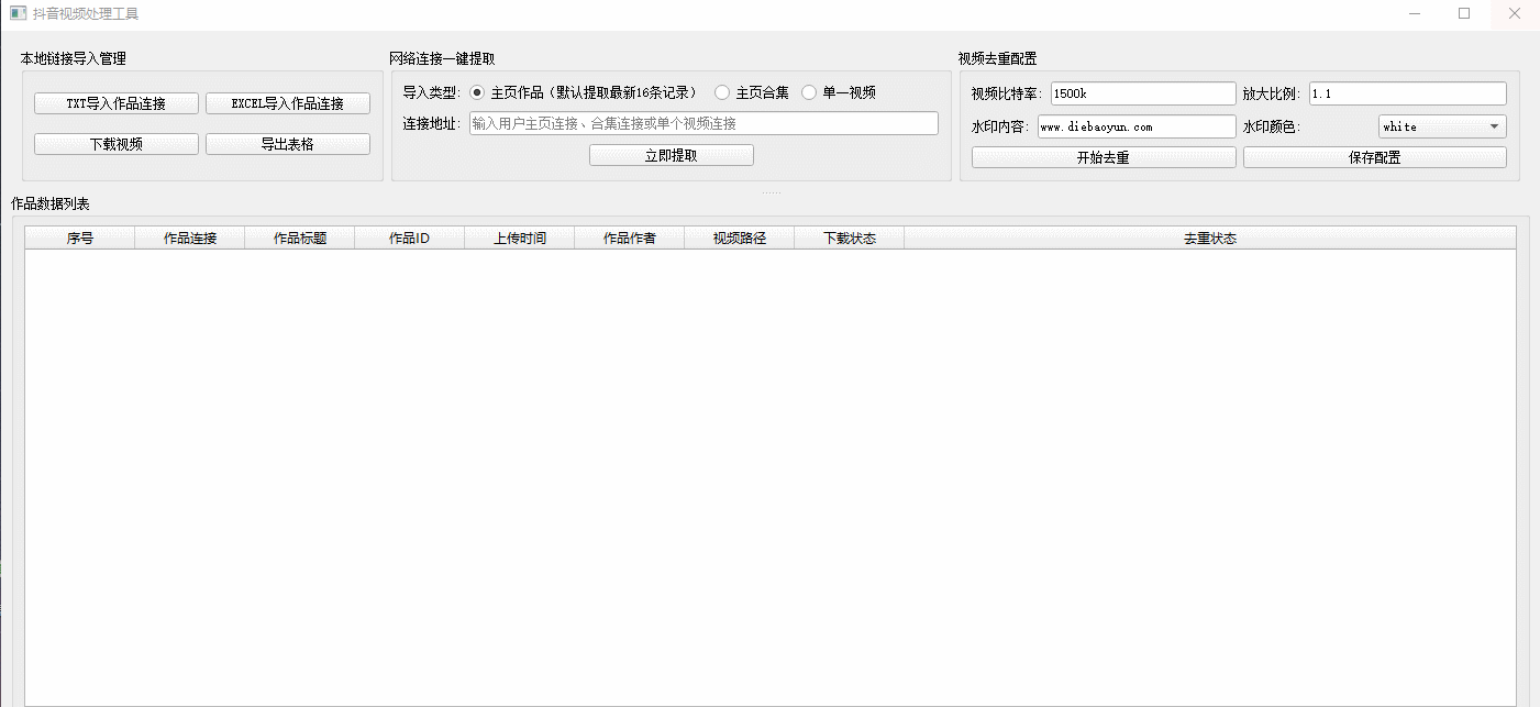 • TXT导入作品连接: 支持导入包含抖音视频链接的TXT文件,自动识别https开头的有效链接