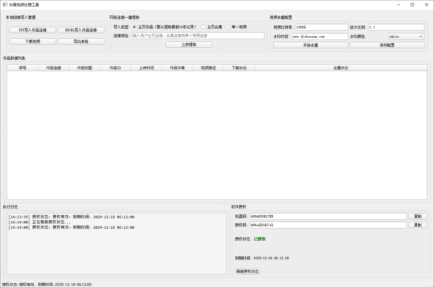 • 九列数据展示: 序号、作品连接、作品标题、作品ID、上传时间、作品作者、视频路径、下载状态、去重状态