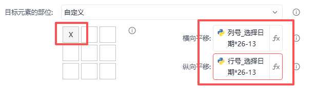 横坐标:列号_选择日期*26-13(减去13即为去掉一半宽度,即点击元素横向中间位置)