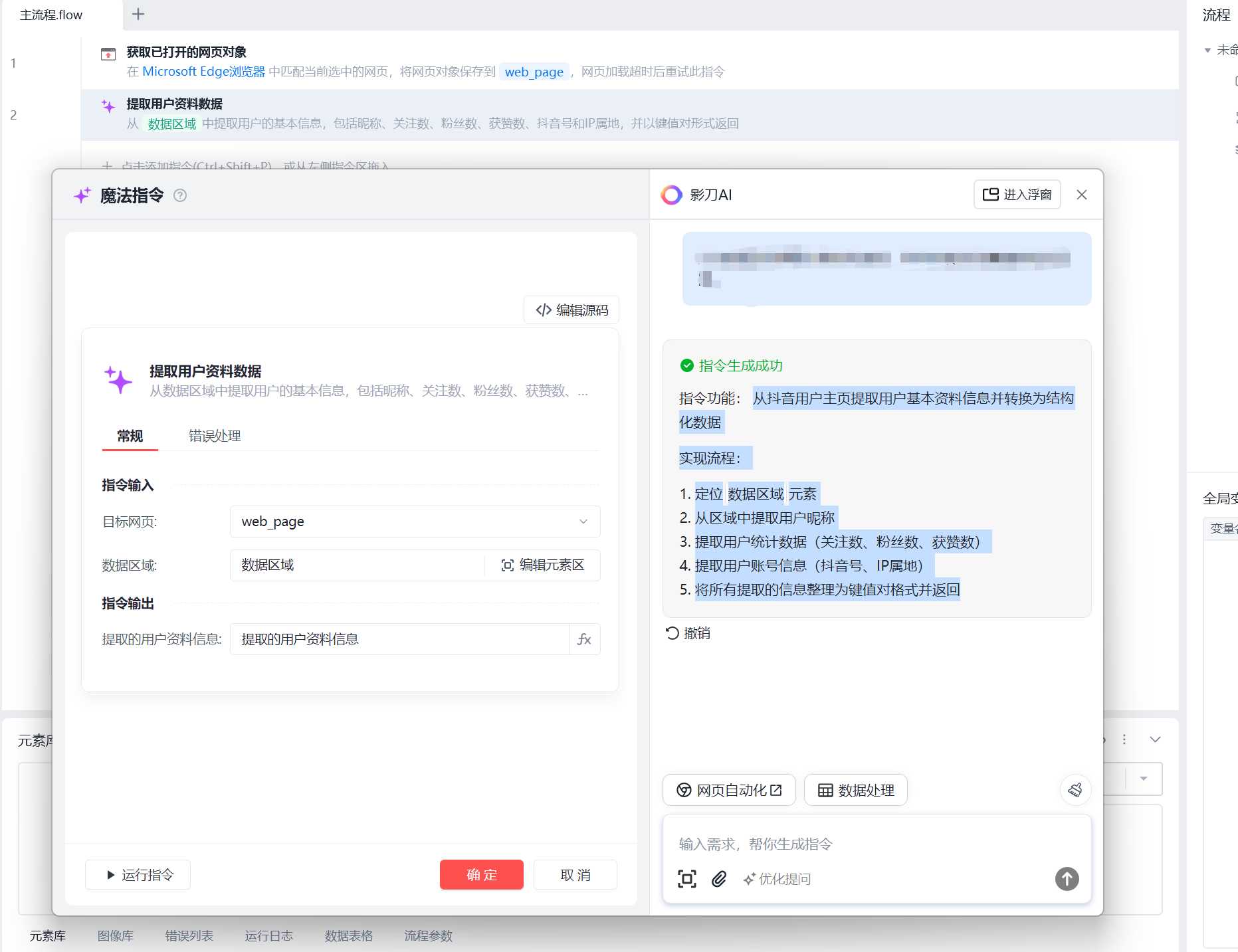 通过影刀RPA的魔法指令功能,只需一句话即可自动完成用户资料提取。操作流程包括:定位数据区域、提取昵称/粉丝数/账号信息等关键字段,并转换为结构化键值对数据。支持批量抓取后导出Excel/飞书表格,还能设置定时任务。新手可通过安装模块+智能修复快速上手,实现高效数据采集。