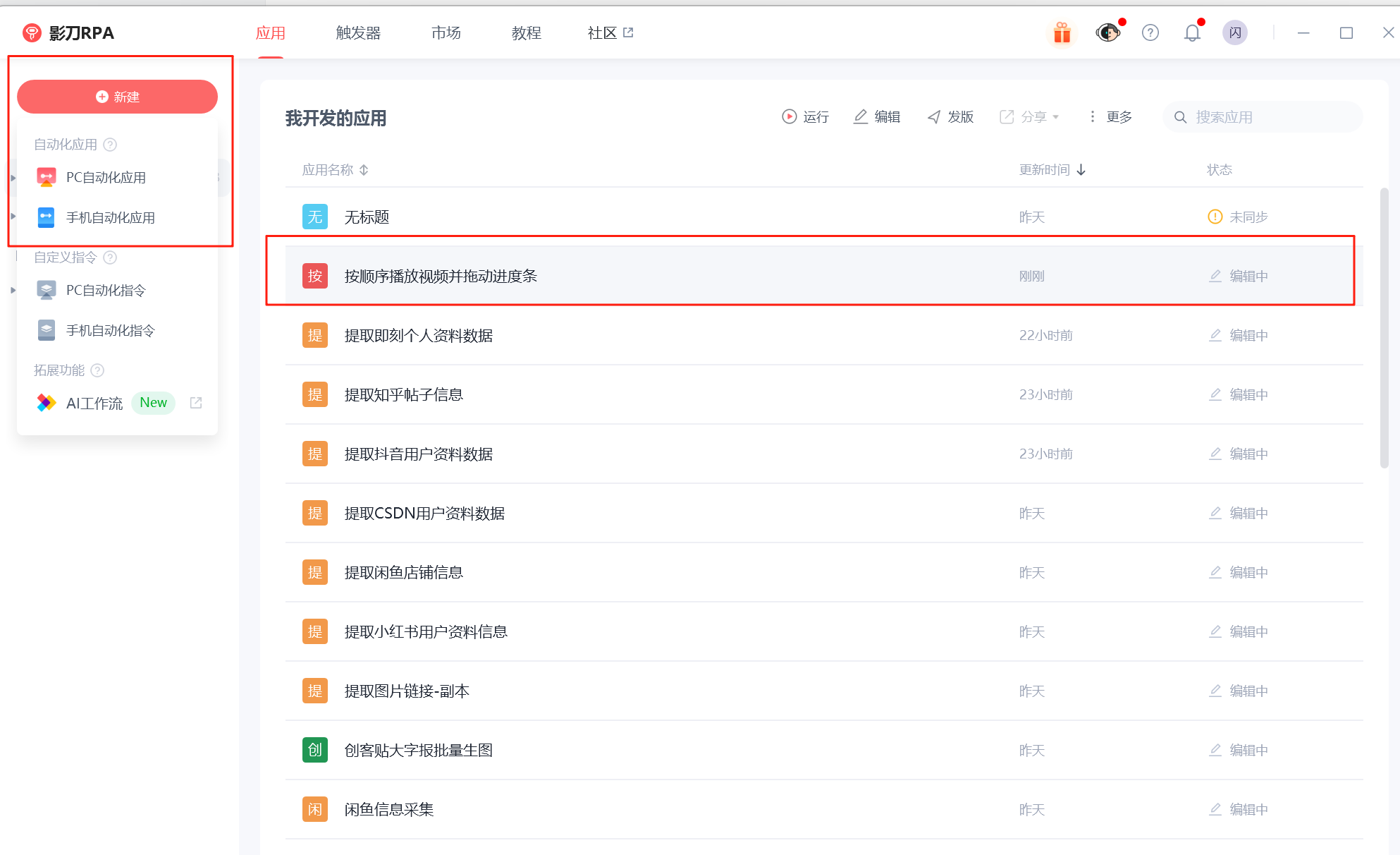 【摘要】影刀RPA推出"魔法指令"功能,可一键实现顺序播放视频并自动拖动进度条至98%位置。该指令能自动定位网页视频元素,逐个点击课程列表项,确保每个视频完整播放。适用于在线课程学习等场景,提升观看效率。操作步骤简单:新建PC自动化应用→输入魔法指令→安装模块(出错可智能修复)即可完成配置。该功能特别适合需要批量观看系列视频的用户,实现全自动化操作。新手用户可参考基础教程进行下载配置。