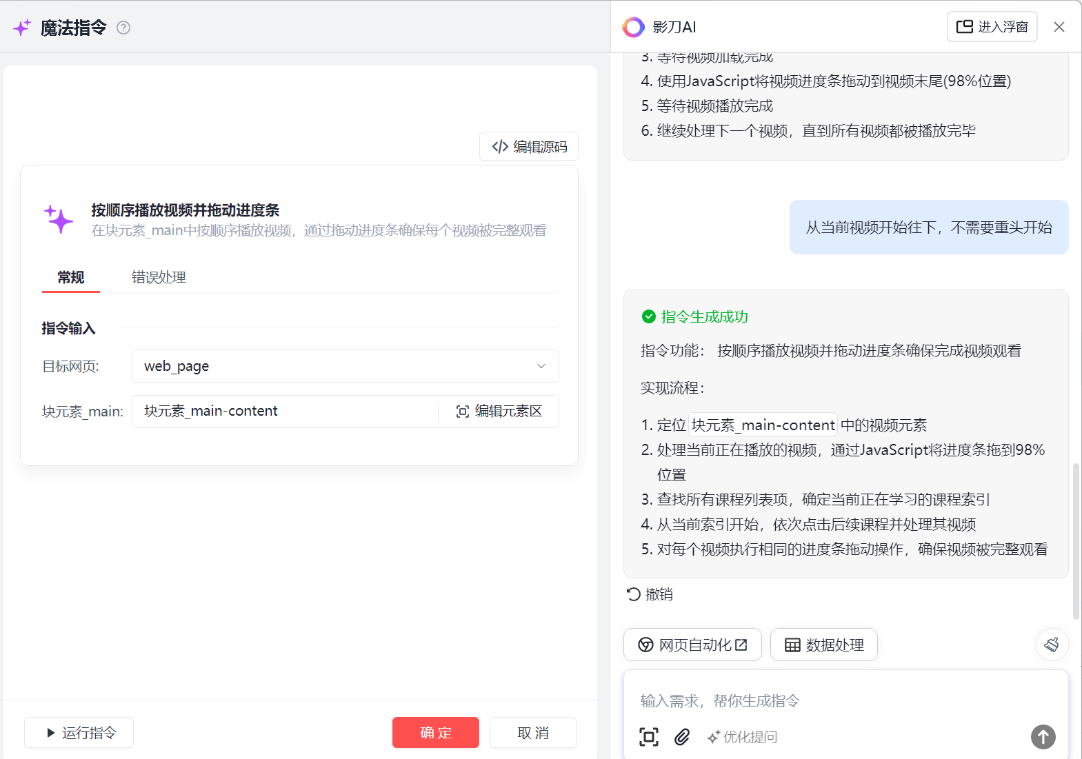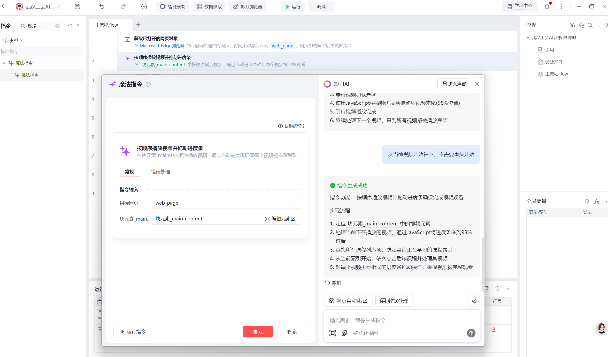 你好,我是邪修闪电RPA!今天带来一款全新设计的魔法指令,让你在自动化脚本中轻松控制视频播放进度条,顺序播放视频并确保每个视频都完整观看。