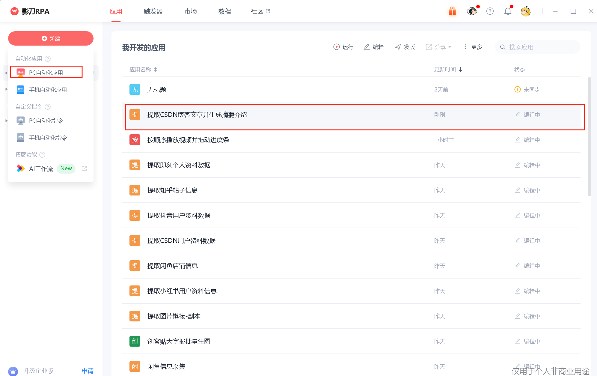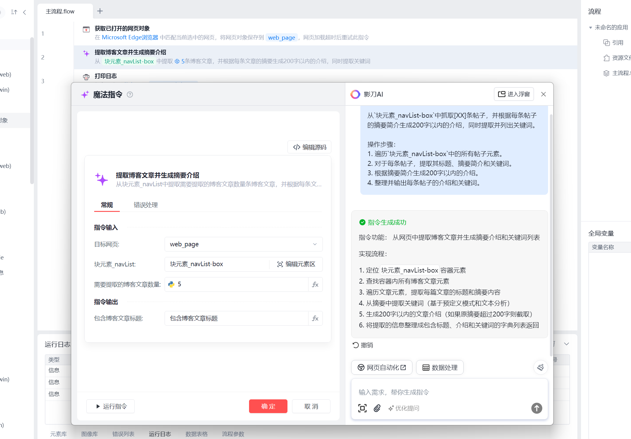 【摘要】影刀RPA推出"魔法指令"功能,可一键提取网页博客文章并自动生成摘要。该指令能从指定网页的navList区块中提取文章,为每篇生成200字简介和关键词列表,支持自定义提取数量。适用于内容管理、信息采集和新闻聚合场景,显著提升工作效率。操作只需新建PC自动化应用并执行指令,还可扩展至生成Excel或飞书文档。新手用户可参考官方下载配置指南,遇到问题可使用智能修复功能。
