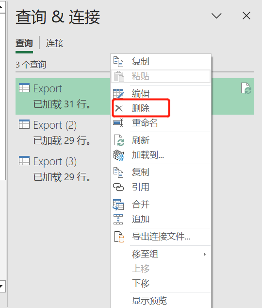 人工的操作,是点击【数据】→点击【查询&连接】→鼠标右键这些数据源→点击【删除】。