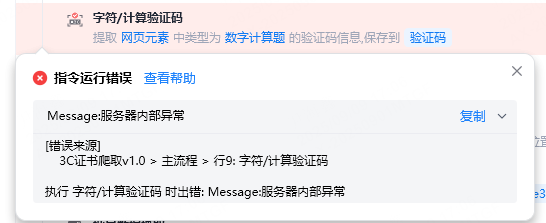 Message:服务器内部异常[错误来源] 3C证书爬取v1.0 > 主流程 > 行9: 字符/计算验证码 执行 字符/计算验证码 时出错: Message:服务器内部异常