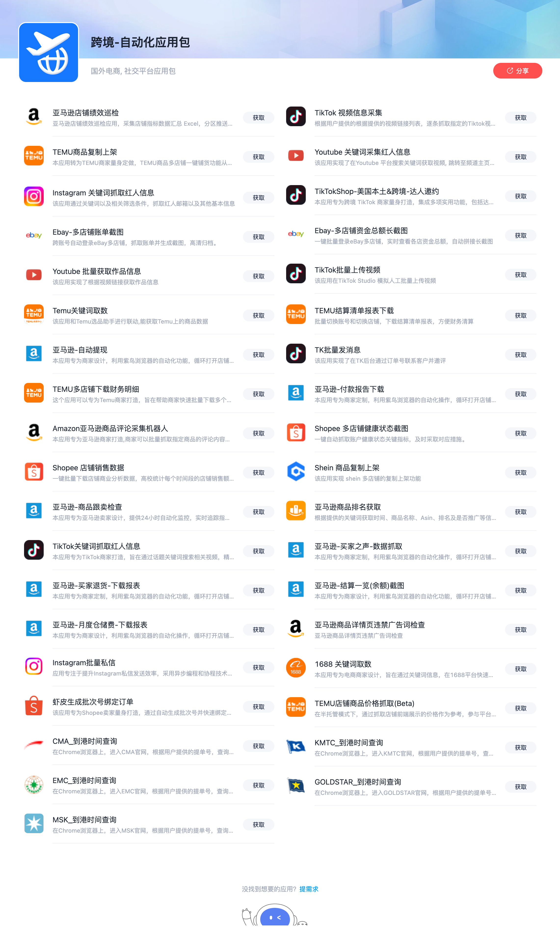 截至目前,我们已经沉淀了40+开箱即用的跨境行业应用,涵盖选品、红人营销、商品上架、物流查询等全链路的业务场景,更多应用也在持续开发中。