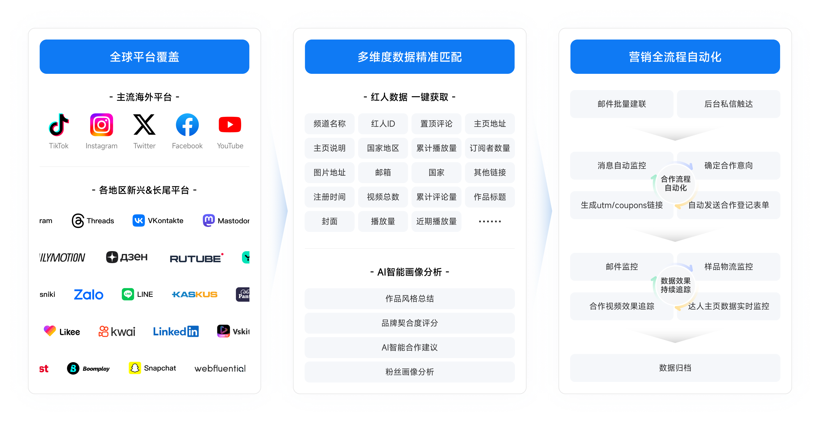 以目前已上线的海外红人营销方案为例,该方案源自多家头部跨境企业的成功实践,完整覆盖从达人筛选、批量触达、合作跟进、样品寄送、数据追踪至效果归档的全流程。