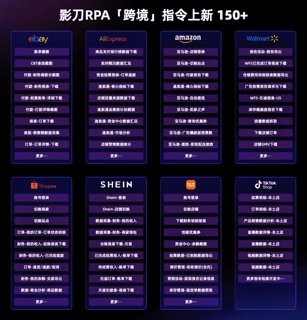 为了更好地服务跨境客群,影刀在产品功能、场景沉淀、服务落地等多维度针对跨境进行了全方位升级,尤其是此次为跨境群体重磅更新了数百开箱即用的自动化指令&应用,旨在将跨境从业者从繁琐操作中彻底解放,帮助更多卖家实现效率提升。
