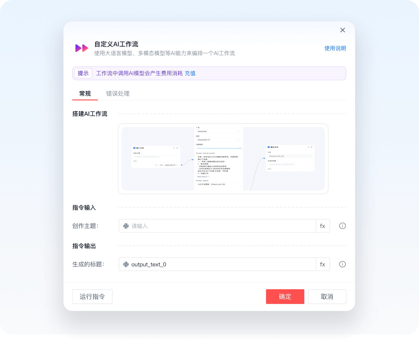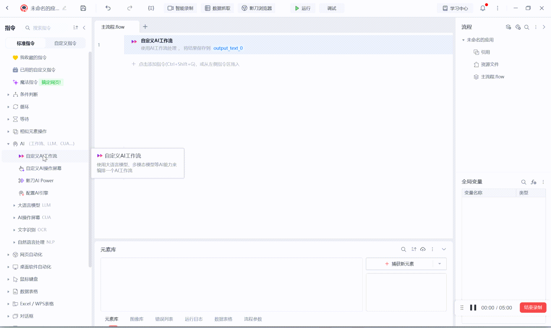 为了提升RPA的AI能力,我们将把 影刀 AI Power 搭建工作流的能力内置到了影刀的流程编辑器里,现在,你可以直接在开发流程时,拖入一条 自定义AI工作流 指令,将大语言模型、多模态模型等AI能力自由编排成一个完整的AI工作流。