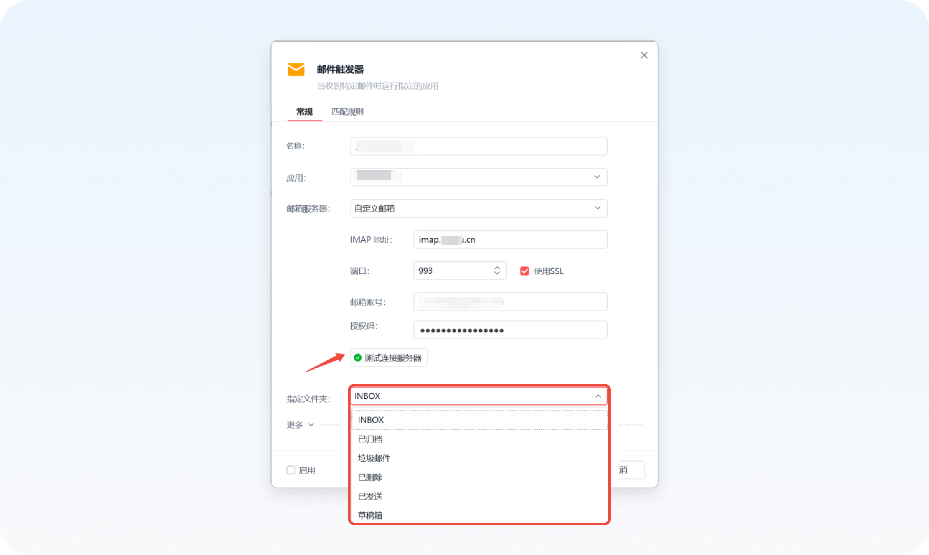 在测试服务器连接后,现在可以选择具体文件夹,让邮件触发更可控。