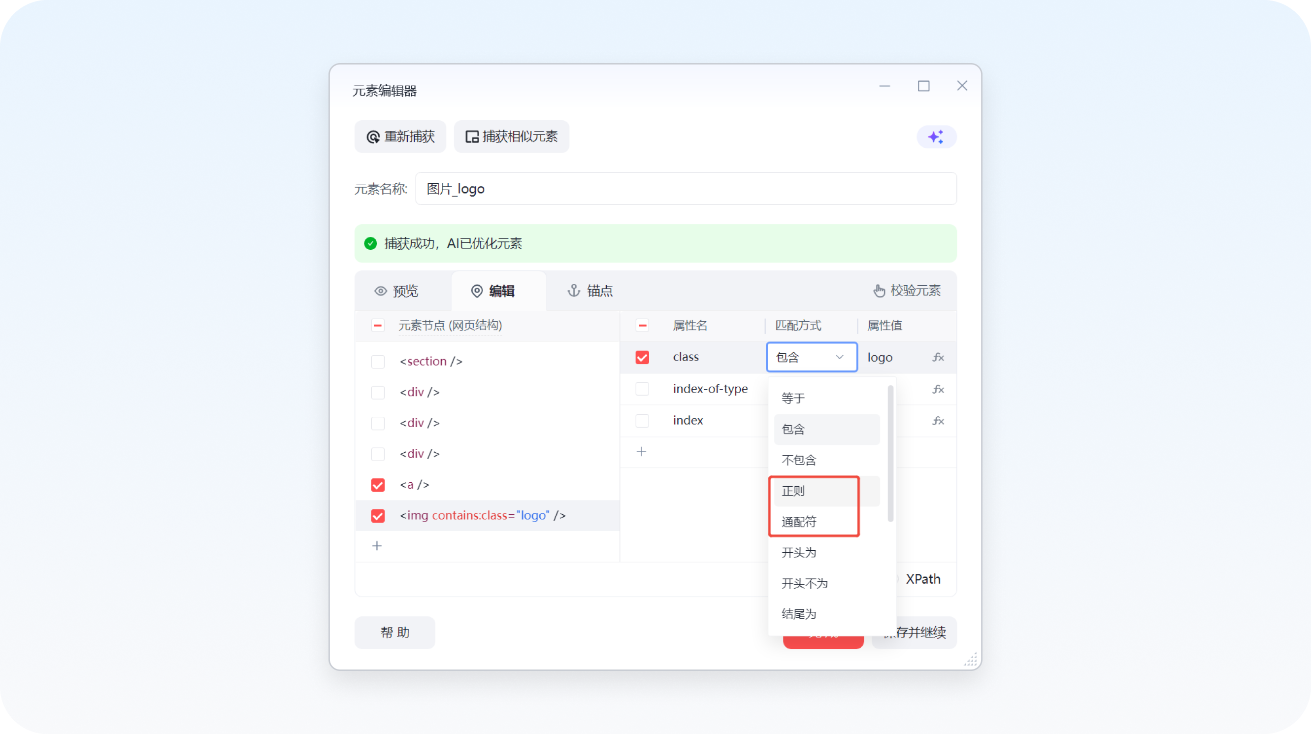新版网页元素编辑器已支持正则与通配符,匹配方式更灵活。