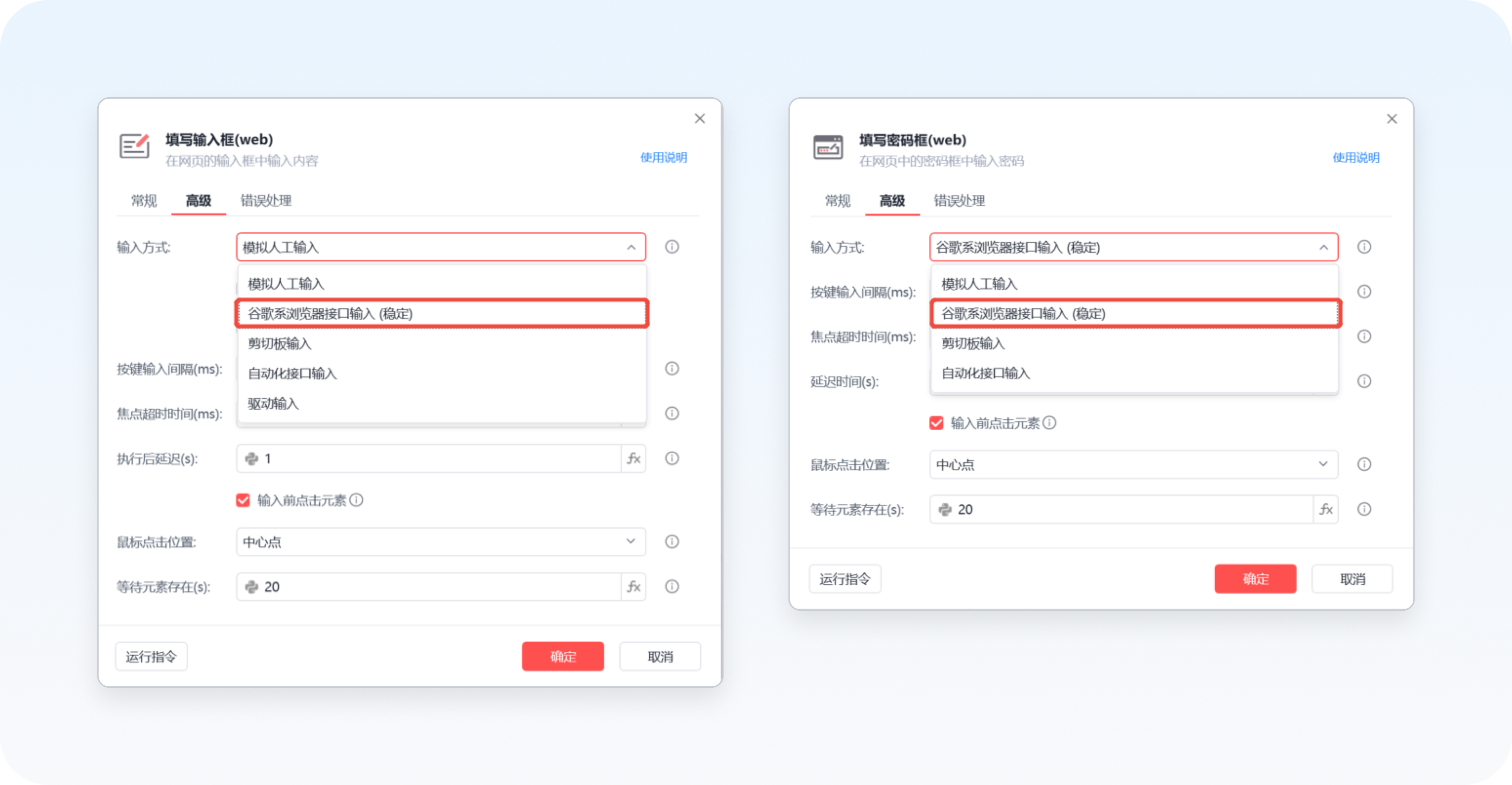 小贴士:以前只有在「打开网页 > 运行时不抢占鼠标」里,才能统一设置为谷歌接口输入;现在可以直接在填写类指令里单独配置。后续,这种输入方式也会逐步成为默认选项。