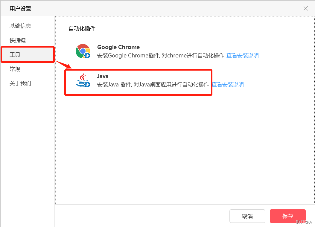 设置 -> 工具 ->自动化插件 -> 点击安装Java插件,等待预安装环境配置完成