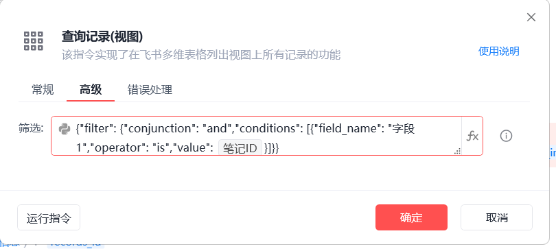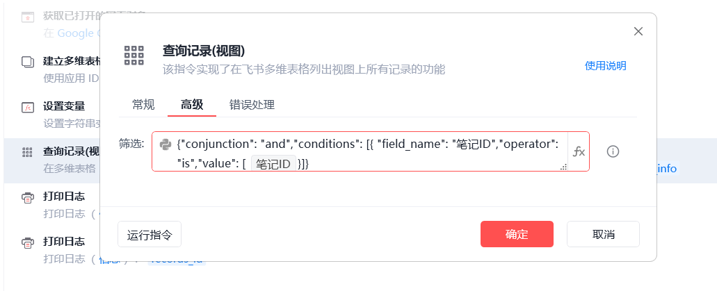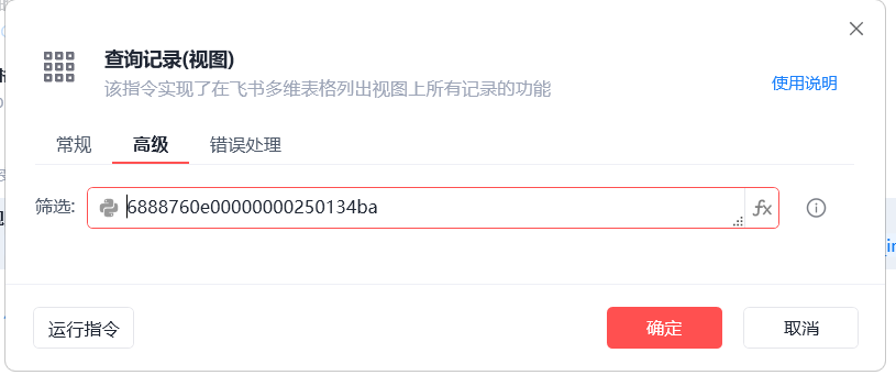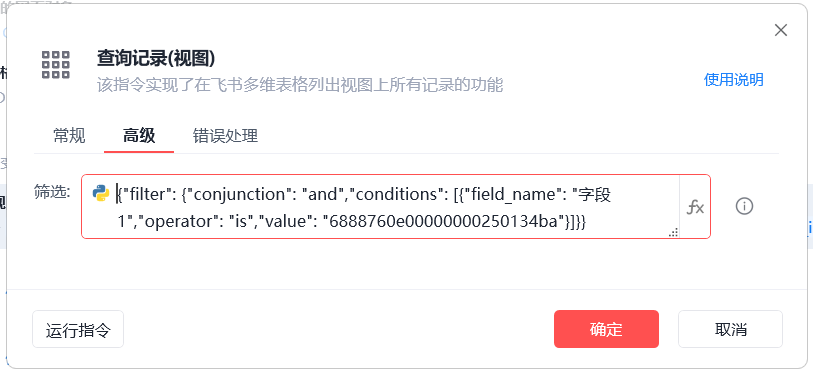 飞书多维表格RPA的指令:查询记录(视图),筛选条件怎么写?