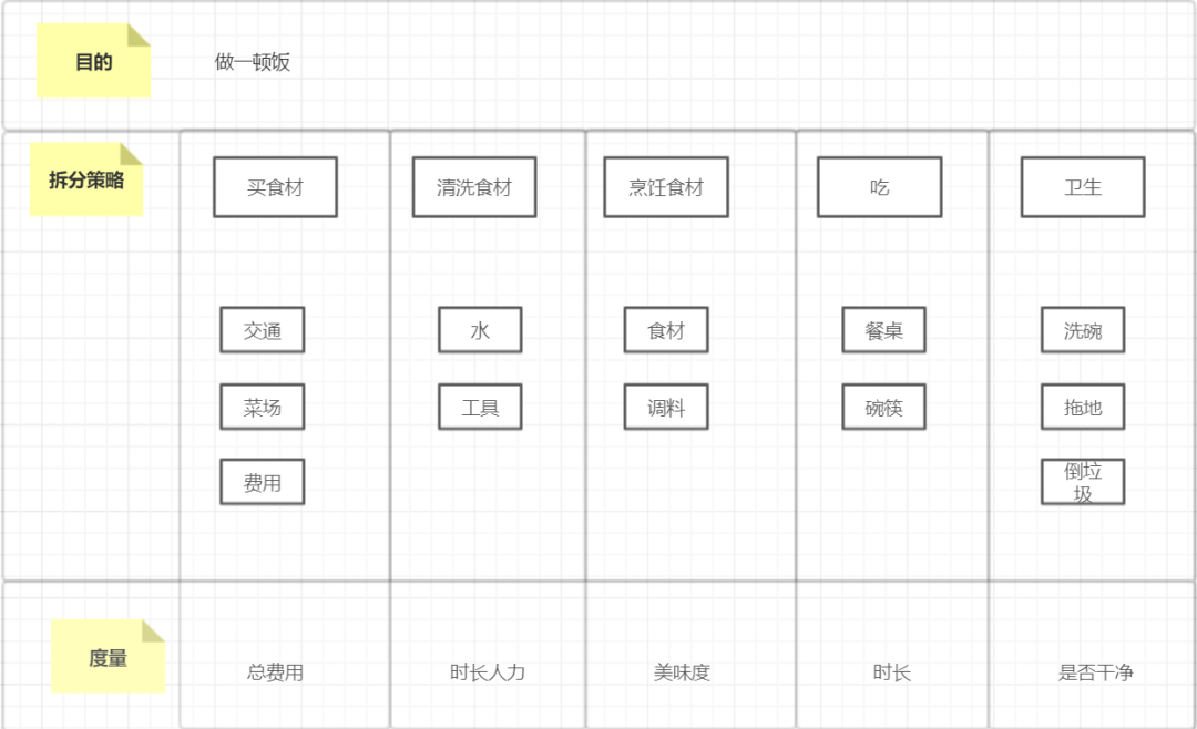 OSM模型就是将目标拆解成为具体的、可落地的、可度量的行为上。通俗的说就是拆解,将目标拆分为若干个组成细颗粒度,赋予其策略、行为操作,然后指标化。我们举一个简单的例子。我们要做一顿晚饭,拆解成策略包含:买、清洗、烹饪、吃、卫生打扫等。