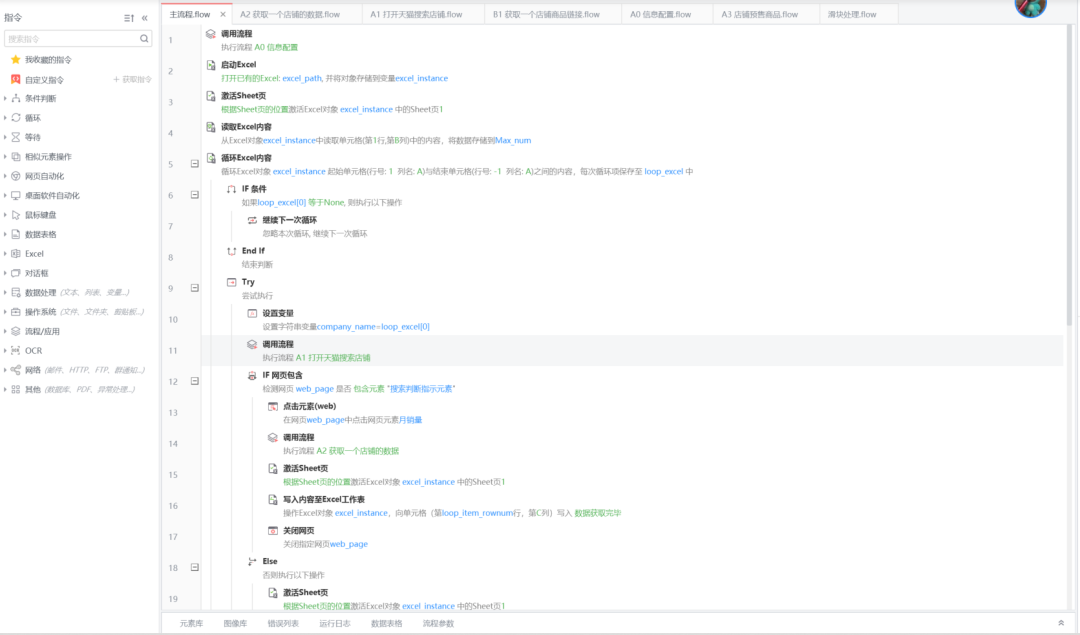影刀RPA支持自动登录平台爬取、处理数据,下图为影刀RPA的“获取店铺数据”应用搭建页面。