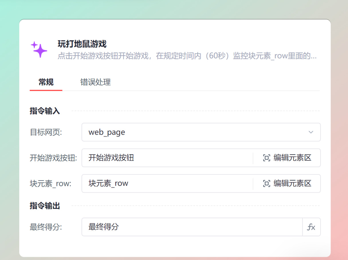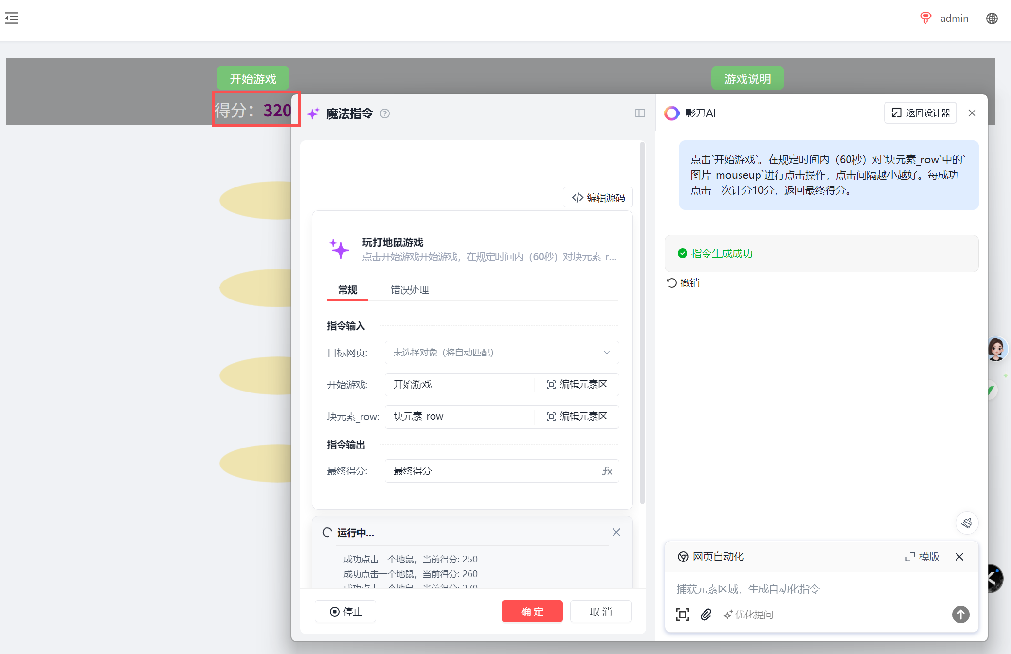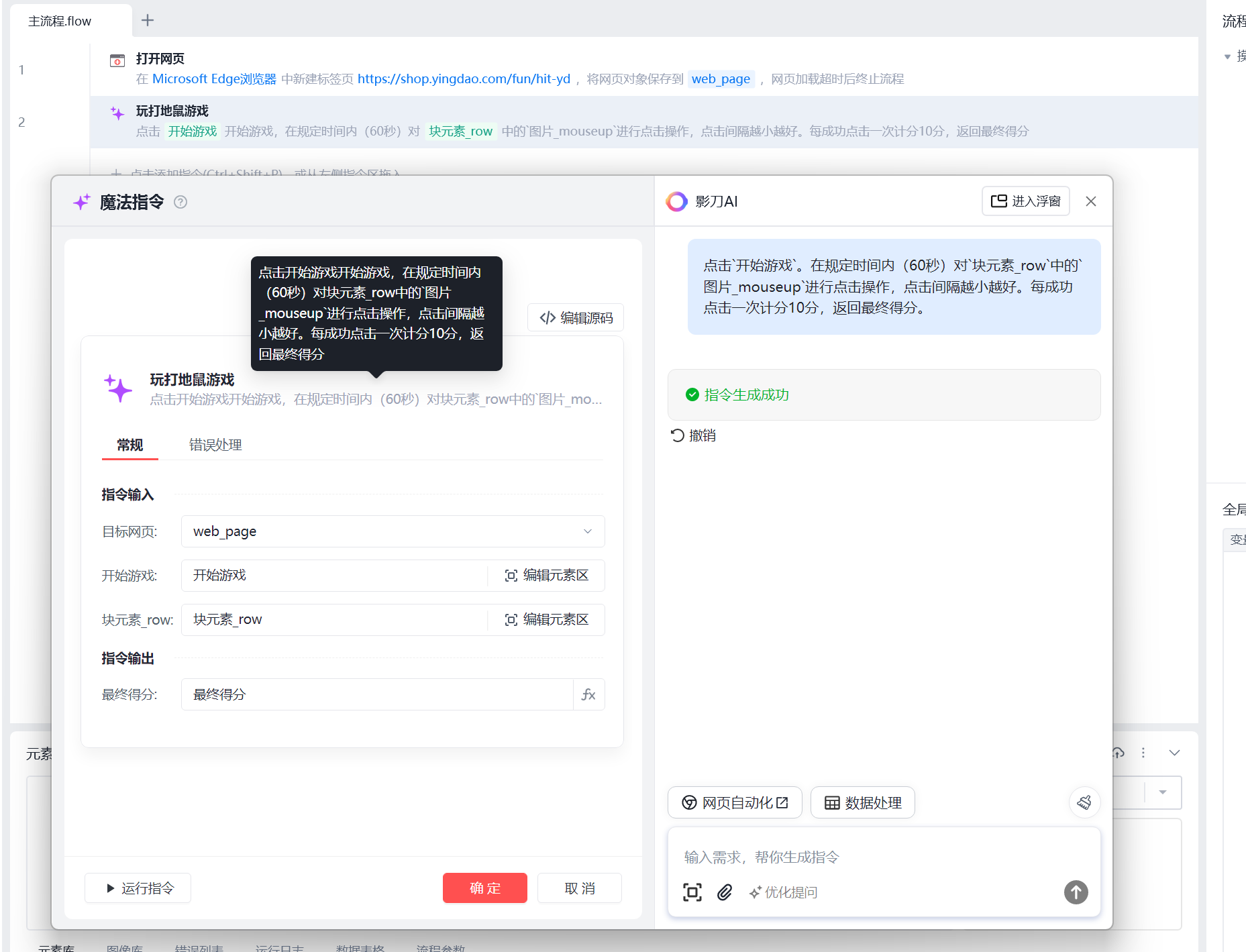 摘要:影刀RPA的魔法指令功能可零代码实现网页游戏自动化。以打地鼠为例,只需输入指令"在规定时间点击游戏元素并计分",AI将自动生成流程:识别网页元素、高频点击计分(每次10分),60秒后输出最终得分。该功能适用于RPA教学、游戏测试及员工培训,无需编程即可完成网页交互自动化,极大降低使用门槛。用户通过影刀设计器配置网页地址和指令参数即可快速运行,展现RPA的智能化和高效性。