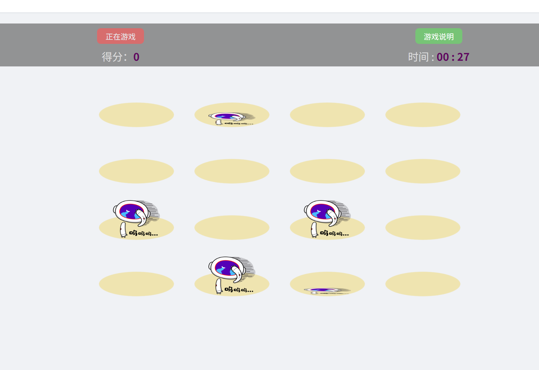 点击开始游戏。在规定时间内(60秒)对块元素_row中的图片_mouseup进行点击操作,点击间隔越小越好。每成功点击一次计分10分,返回最终得分。