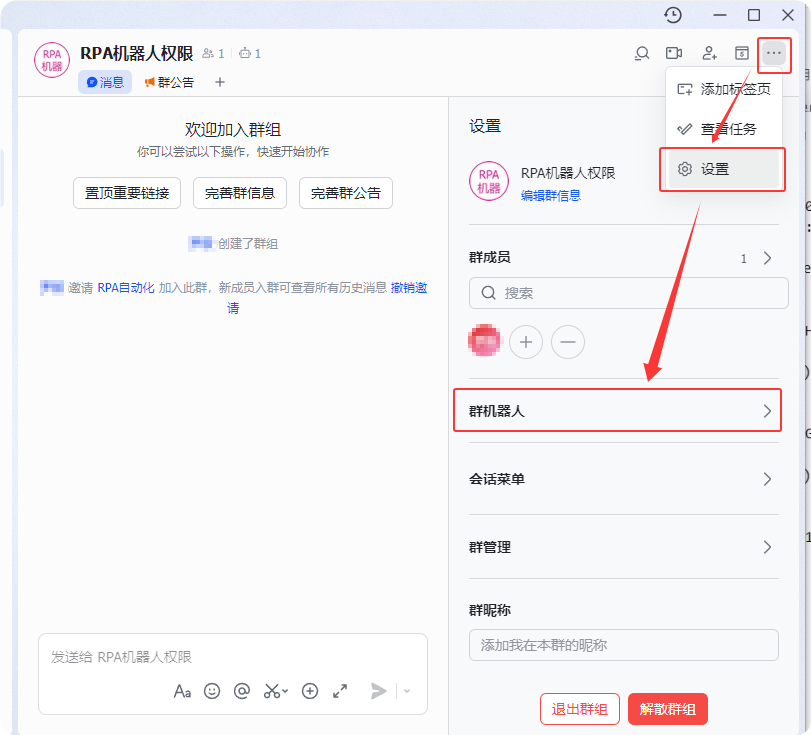 2.新建一个群聊并设置群机器人,把创建好的飞书应用拉入到群内