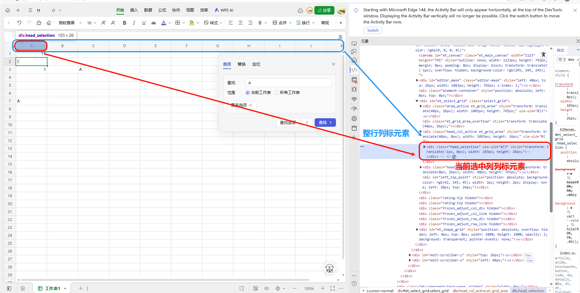 检查了在线表格的源码可以看到,源码中只显示当前选中的单元格的列号元素,也就是只能捕获当前选中单元格的列号元素