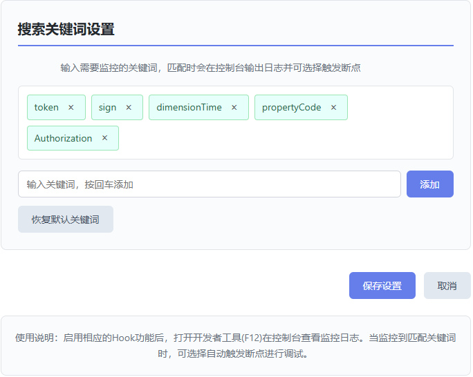 调试模式与关键词设置配合使用。当开启调试模式后,插件会检查监控到的所有内容是否包含在高级设置中配置的关键词。如果包含匹配的关键词,插件会自动触发JavaScript断点,使浏览器暂停执行,便于开发者进行调试分析。