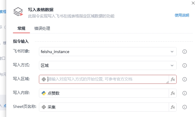 这个是采集到的一个账号的点赞数,现在需要把这个点赞数写入飞书表格,试了很多方法还是报错。这里需要和循环到的账号相匹配,如果有这个账号不存在自动跳到下一个账号对应的数据栏填写,这里好像和Excel不一样,Excel写入的时候有写入列,这里没有