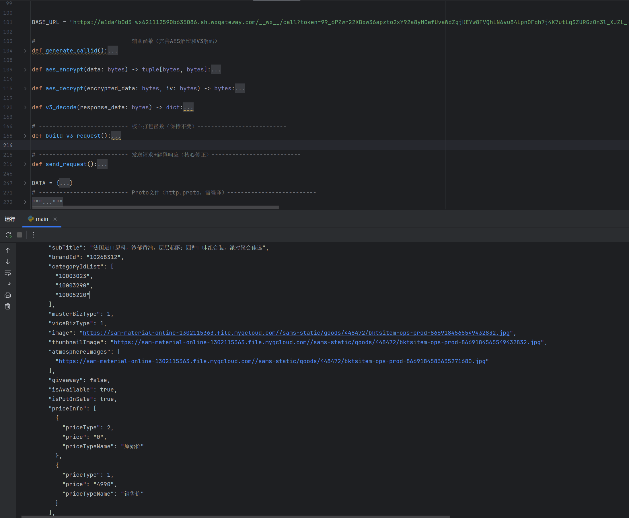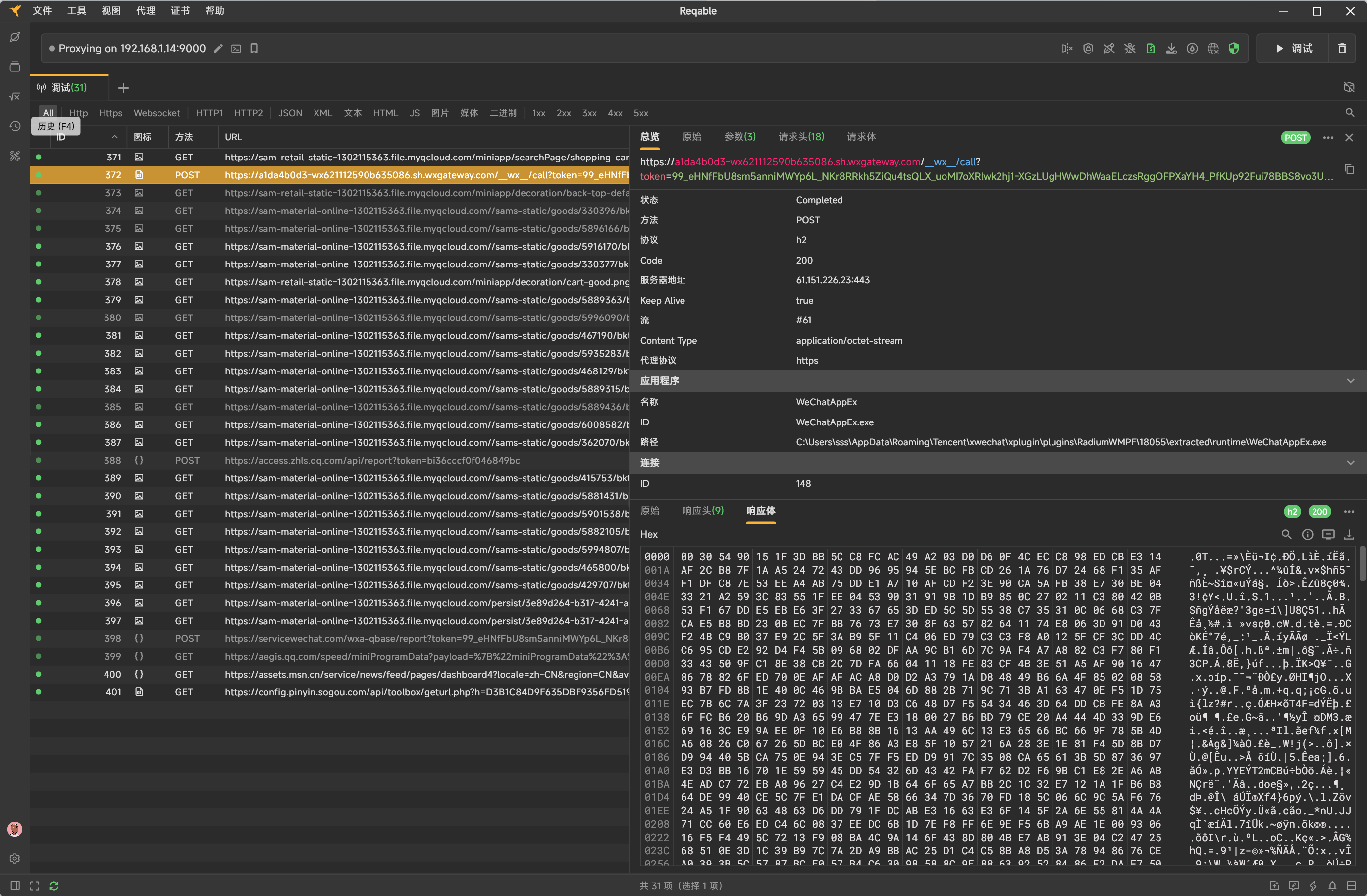 3、开始逆向。发现比想象中的还要复杂很多。所有请求,都是以protobuf的形式,通过微信网关去调用实际的业务接口。三进三出之后,搞定了。