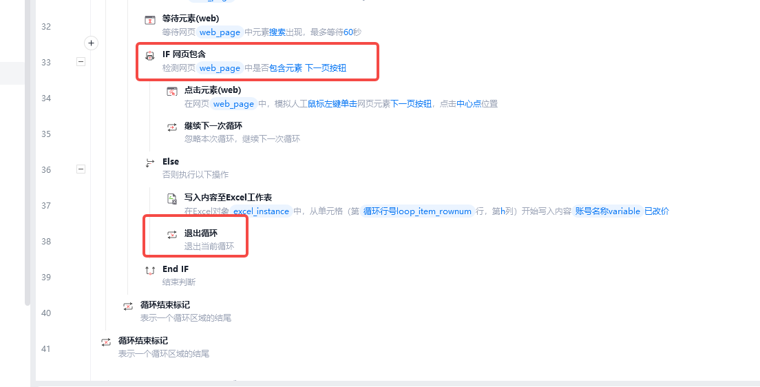 我想要的效果是运行到最后一页就重新输入账号,再每一页操作,但是这个指令,运行到最后一页,还是在点击下一页按钮,不知道哪里写错了