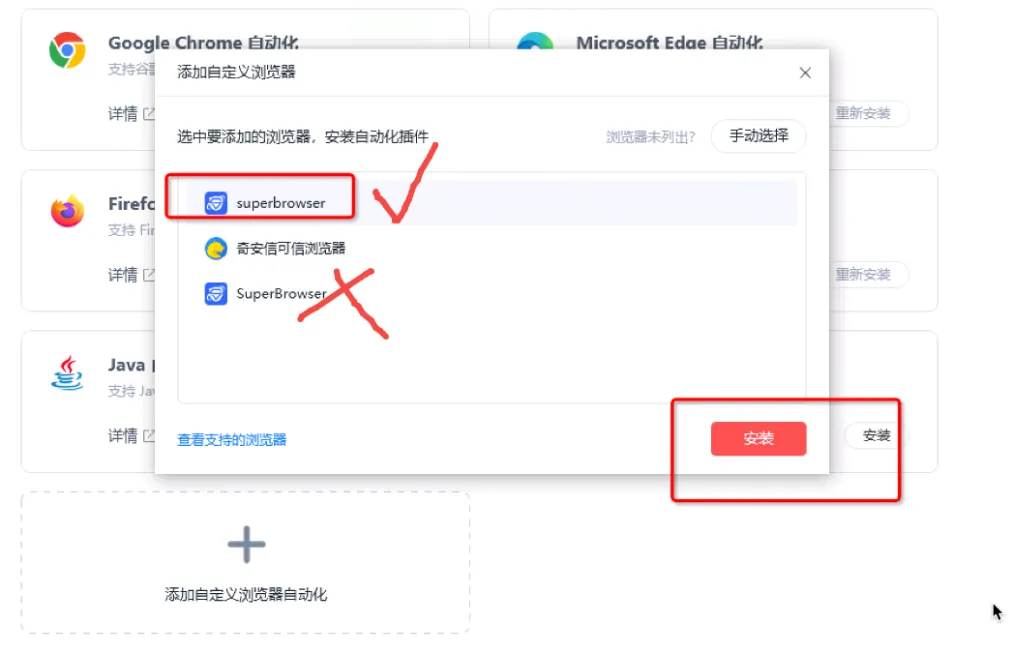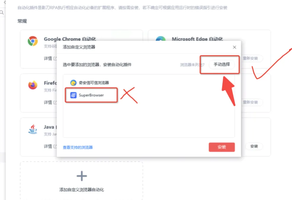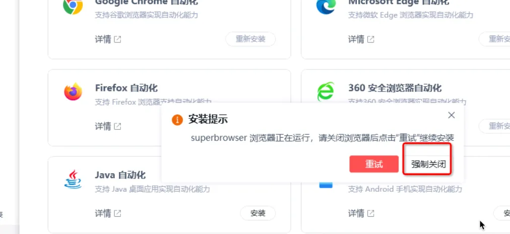 完成以上步骤,按下图指示选择小s开头的superbrowser后强制安装,则影刀客户端配置紫鸟插件完成!!