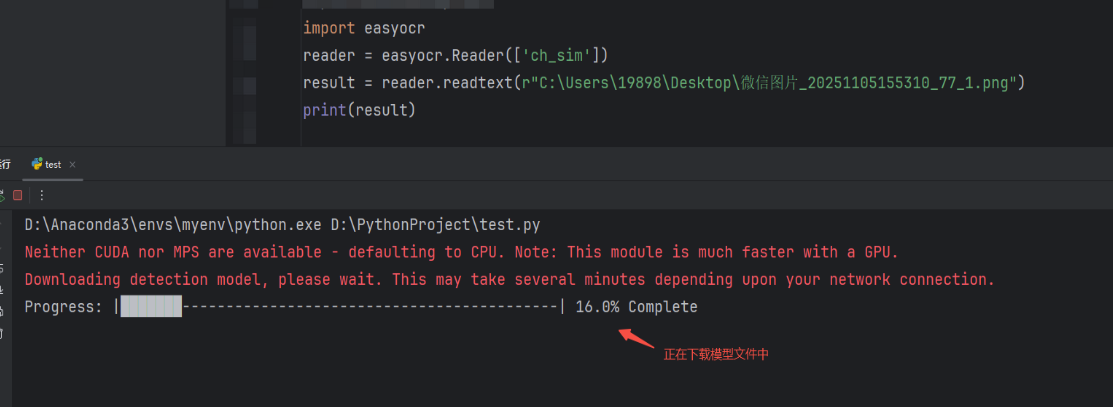 reader = easyocr.Reader(['ch_sim', 'en'], gpu=False)这样 EasyOCR 就不会去检查 CUDA 或 MPS 设备了,直接使用 CPU。