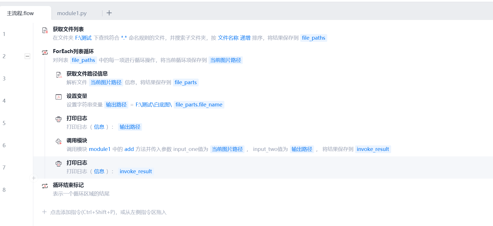 # 4. 可视化流程中可以通过"调用模块"的指令使用此模块