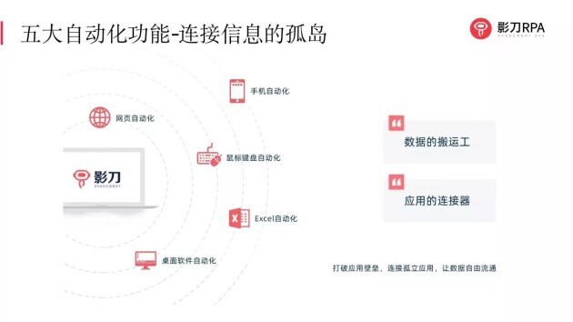 影刀RPA具备以下几个方面的自动化能力:桌面软件及Web程序自动化、手机自动化、鼠标键盘自动化、Excel自动化、数据库及SQL自动化五大方面。