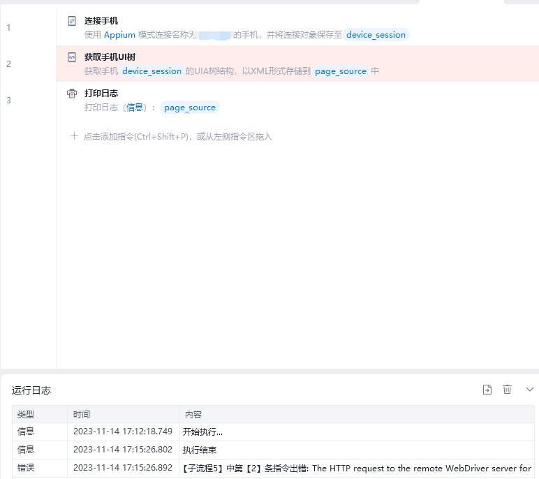 1.我正在研究手机自动化操作,在运行“获取手机UI树”指令时,报错:The HTTP request to the remote WebDriver server for URL http://127.0.0.1:4723/wd/hub/session/d6ea4cf5-f60f-498b-af6b-dde199f*****/source timed out after 60 seconds.