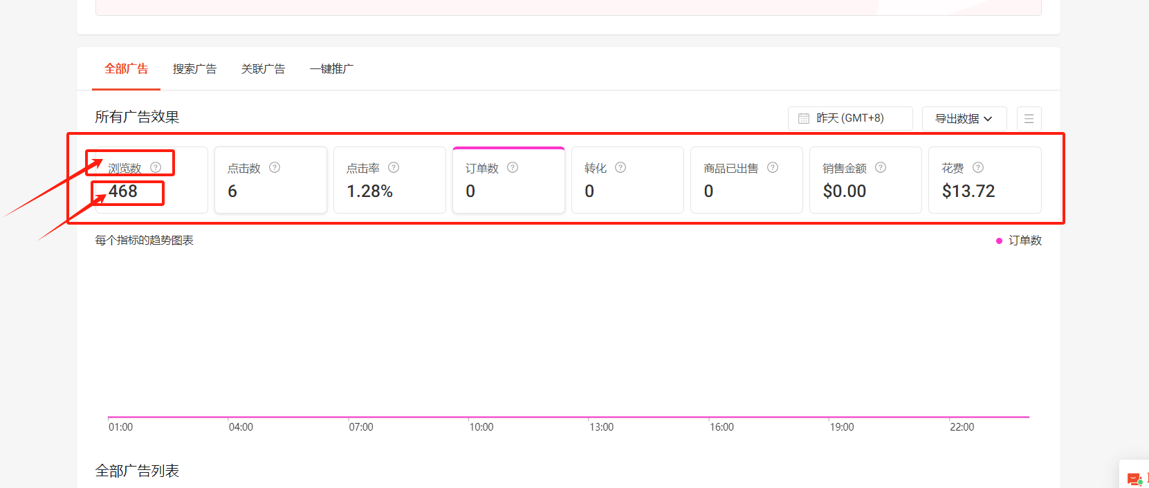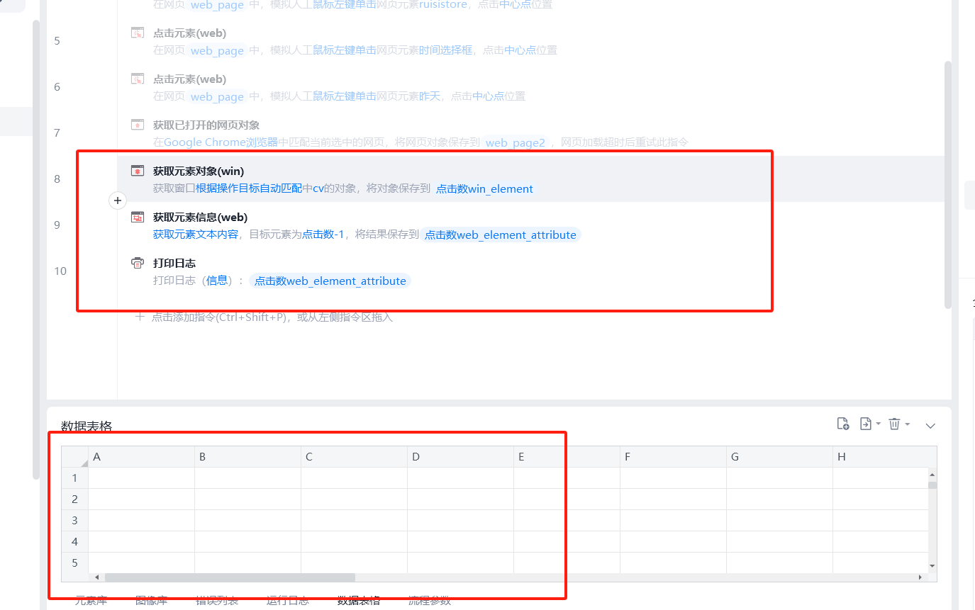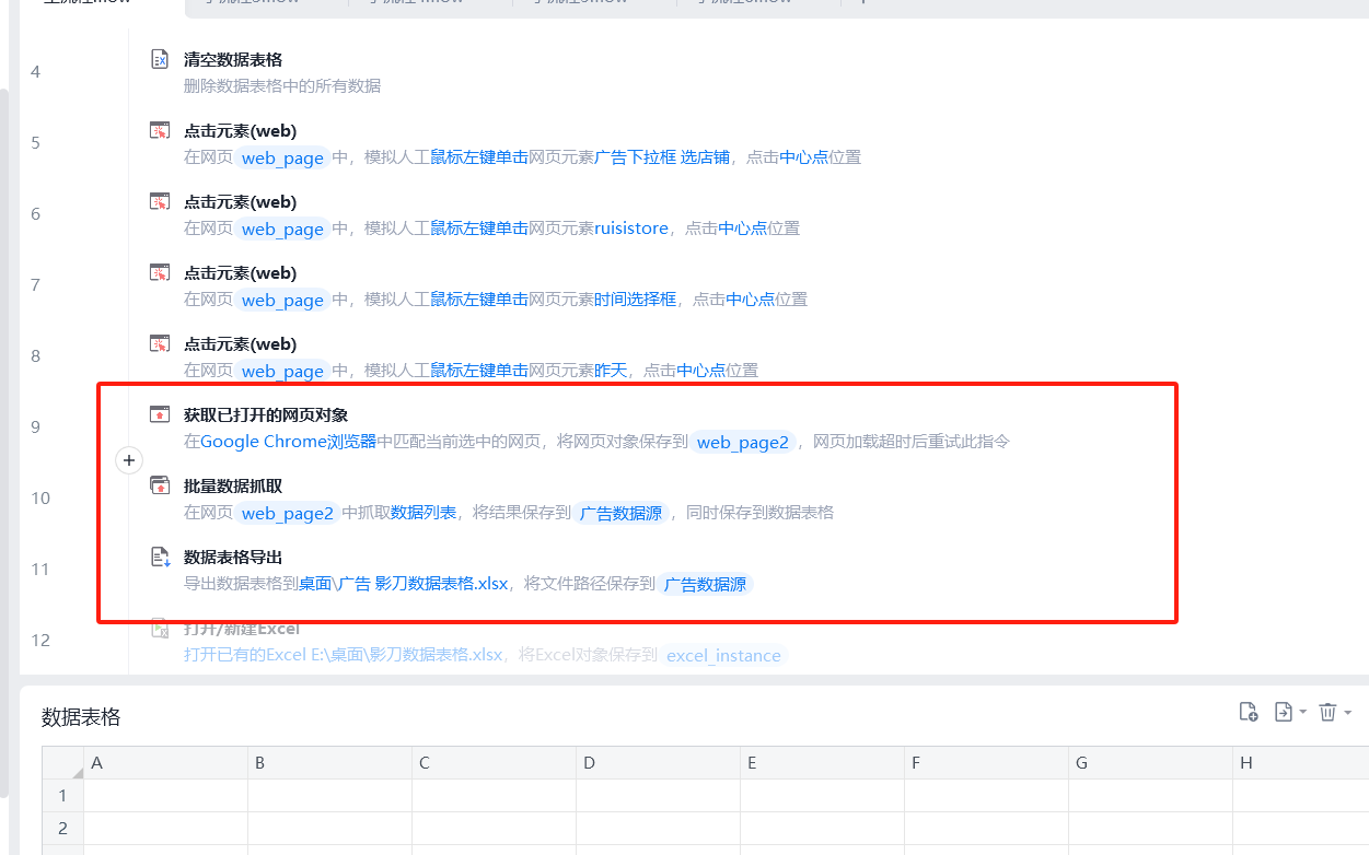 列:获取第一个框 浏览数,和数值468,并且储存为变量,输出在表格。之后依次重复后面的点击数、点击率等、、、8个框。