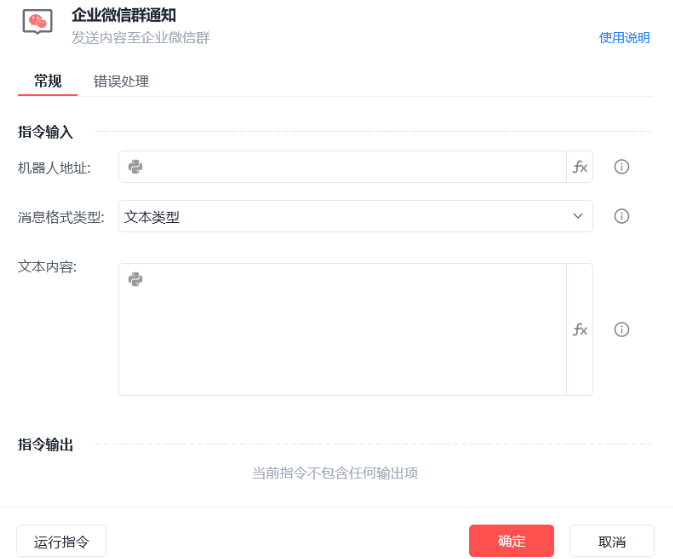 企业机器人Webhook:如果仅需在内部群发消息,推荐直接调用影刀的“发送企业微信机器人消息”指令。只需在群设置中添加机器人并获取 Webhook 地址即可。