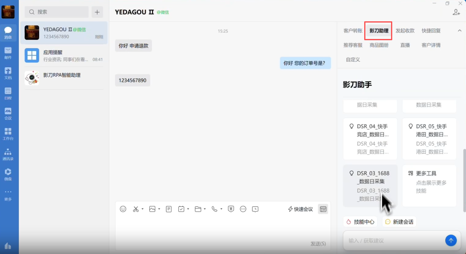 场景示例:客服在聊天时,点击侧边栏“同步订单”按钮,影刀自动抓取当前客户信息并录入 ERP 系统。