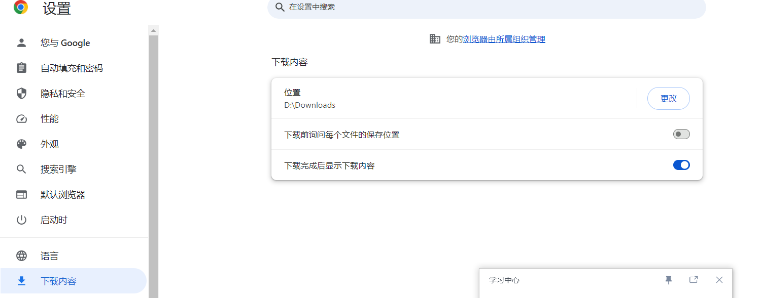 未找到浏览器下载菜单窗口,请前往浏览器的"设置-下载"界面,启用"下载开始时显示下载菜单"选项。最新的谷歌浏览器没有"下载开始时显示下载菜单"选项